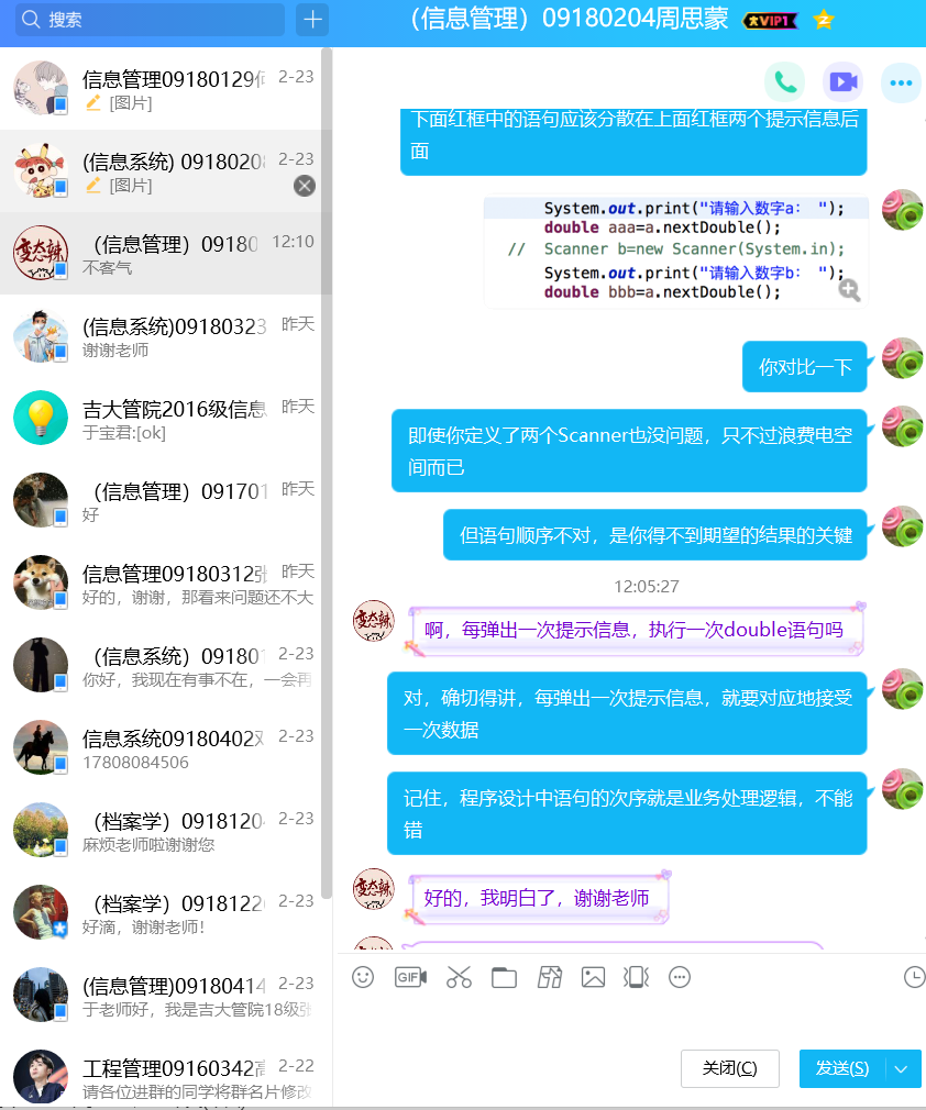 为了确保所选的平台经得起考验,于老师特意提前主动联系学生,在2月10日组建了课程群。并在2月15日、23日先后进行了两次试课。并根据试课中反馈出的问题,形成了书面的在线教学方案——《“面向对象程序设计”课程在线授课方案》。在方案中,详细地写明了在线教学所需的平台及注册方式、教学流程、课前准备、课后答疑、异常情况的处理等。