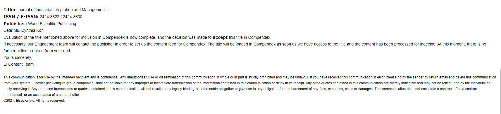 2021年5月,管理学院英文期刊《产业集成与管理:创新与创业》(JIIM:I&E)已被批准进入EI Compendex 检索。