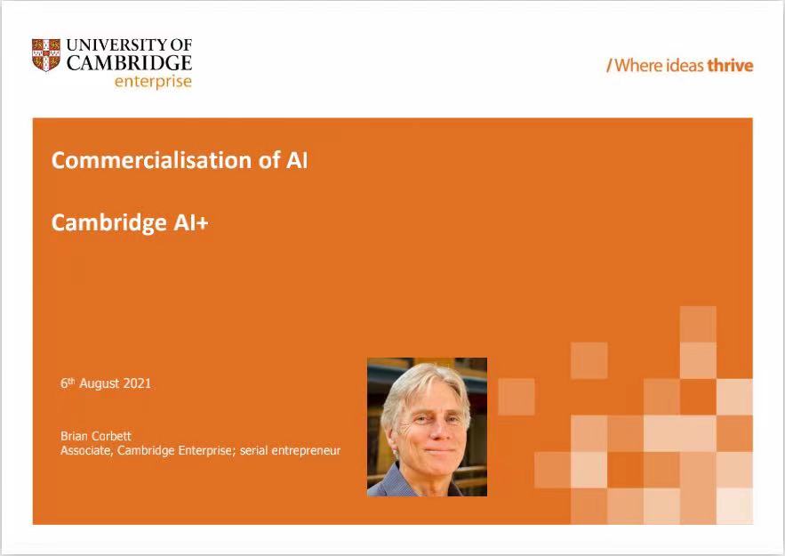 课程带领学生走进人工智能的科研转化,了解剑桥的产学研模式,以讲座加答疑的方式启发学生的思维能力,让学生切实感受到剑桥企业创造的蓬勃的经济发展势态。Smeets博士在进行自我介绍后,列出了一系列商业化问题的思考,从而引出商业化流程等相关的知识;Corbett老师则由人工智能商业化的历史出发,讲授了人工智能价值链和人工智能商业化用途的案例研究等内容。