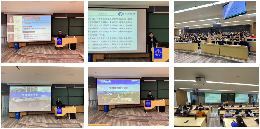 11月10日下午,管理学院2020级本科生专业分流宣讲大会在南岭校区逸夫楼511教室和516教室同时进行。管理学院教学副院长马捷向同学们解读了《管理学院2020级学生专业方向分流工作实施细则》,强调了分流工作尊重意愿与成绩择优相结合、公平公正与公开透明相结合等工作原则。信息管理与信息系统、大数据管理与应用专业的马捷、于宝君老师、物流管理专业的姚舜老师、工程管理专业的王东老师、工商管理专业的杨红、郭润萍老师、会计学专业的孟庆顺、满媛媛老师、市场营销和人力资源管理专业的古安伟老师进行了详细的专业介绍,两个会场近400名同学认真听取老师讲解,管理学院学生办公室、教务办公室的工作人员在宣讲现场为同学们服务。