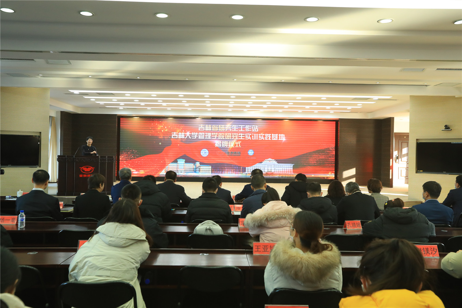 管理学院研究生实训实践基地揭牌仪式在吉林亚泰(集团)股份有限公司会议厅隆重举行。吉林省教育厅科研产业处副处长闻博,校研究生院副院长兼培养办公室主任徐淮良,校研究生培养办公室副主任宋淑敏,亚泰集团副董事长、总裁刘树森,亚泰集团副总裁、总经济师王化民,管理学院院长李北伟,副书记张捷,副院长李雪灵,副院长马腾及校内外相关单位领导和师生代表参加了揭牌仪式。仪式由李雪灵副院长主持。