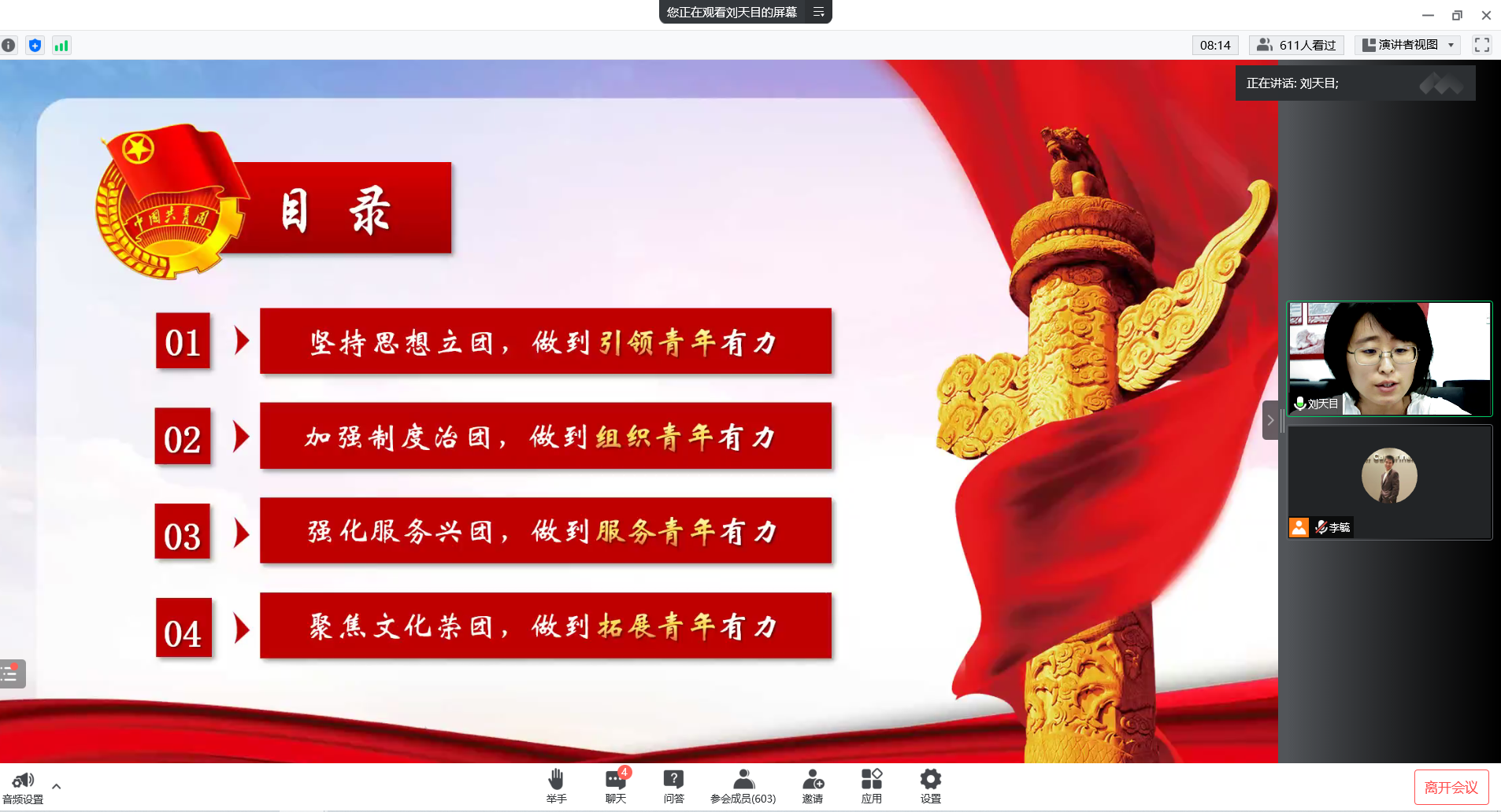 为加强2022级新生的共青团团员意识,深化共青团情怀,增进对党和团的认识,好色 团委书记刘天目老师于2022年8月30日通过腾讯会议为2022级新生举办了“以青春之名,续写时代华章”的线上主题团课活动。
