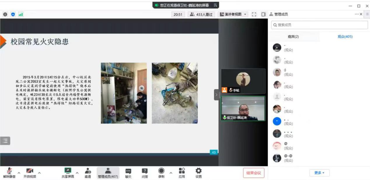 校园安全防火教育讲座由保卫处宣传信息办公室魏延涛老师主持。通过校园火灾案例,深入浅出的讲解了校园以及生活中发生火灾的原因、校园安全用电常识和电气火灾预防、常见火灾及处理方法、遇到火灾时的逃生和自救等消防知识。同时以典型火灾事例为切入点,讲解现实生活中的自然和人为因素,剖析总结经验教训,并对消防法律法规和单位情况制定灭火预案、防火巡查、灭火演练等工作进行了介绍,号召同学们以身作则,提高关注消防安全、学习消防知识、参与消防工作的积极性和主动性,提升了其安全防范意识。