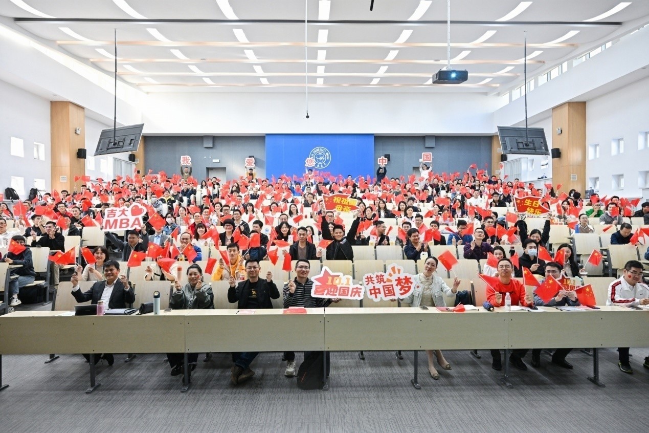 同学们的思绪穿过高山越过平原,跨过奔腾的黄河长江,贯穿风云变幻的华夏岁月,深深地同祖国母亲心连心、同呼吸、共命运。MBA学子一张张激情澎湃的笑脸,将一颗颗赤子之心定格在这美好的瞬间!那一抹鲜艳的中国红永远是吉大MBA人心中最美的风景,伟大的祖国,祝您生日快乐、繁荣昌盛、国泰民安!