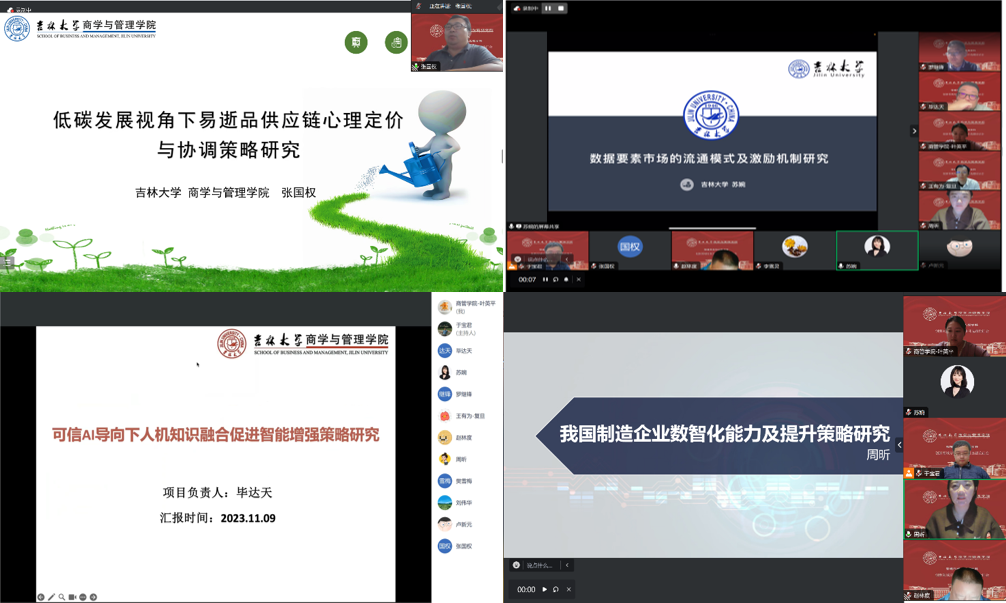 随后,张国权副教授、苏婉副教授、毕达天教授、周昕副教授分别就“低碳发展视角下的易逝品心理定价与供应链协调策略研究”、“数据要素市场参与的流通模式及激励机制研究”、“可信AI导向下人机知识融合促进智能增强策略研究”、“我国制造企业数智化能力及提升策略研究”等选题,向各位专家组成员进行了介绍。诸位老师分别对选题的背景、意义、必要性、创新性等逐一进行汇报。