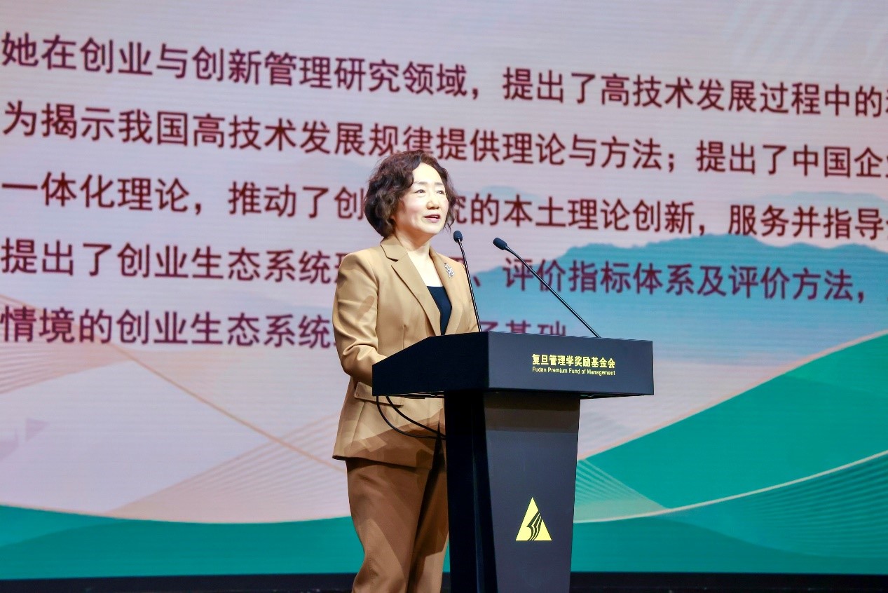 教授、创新创业研究院院长蔡莉教授在论坛上获颁2022年度“复旦管理学杰出贡献奖”,并在本年论坛现场作以《创新驱动创业:理论框架与前瞻》为题的主旨演讲。