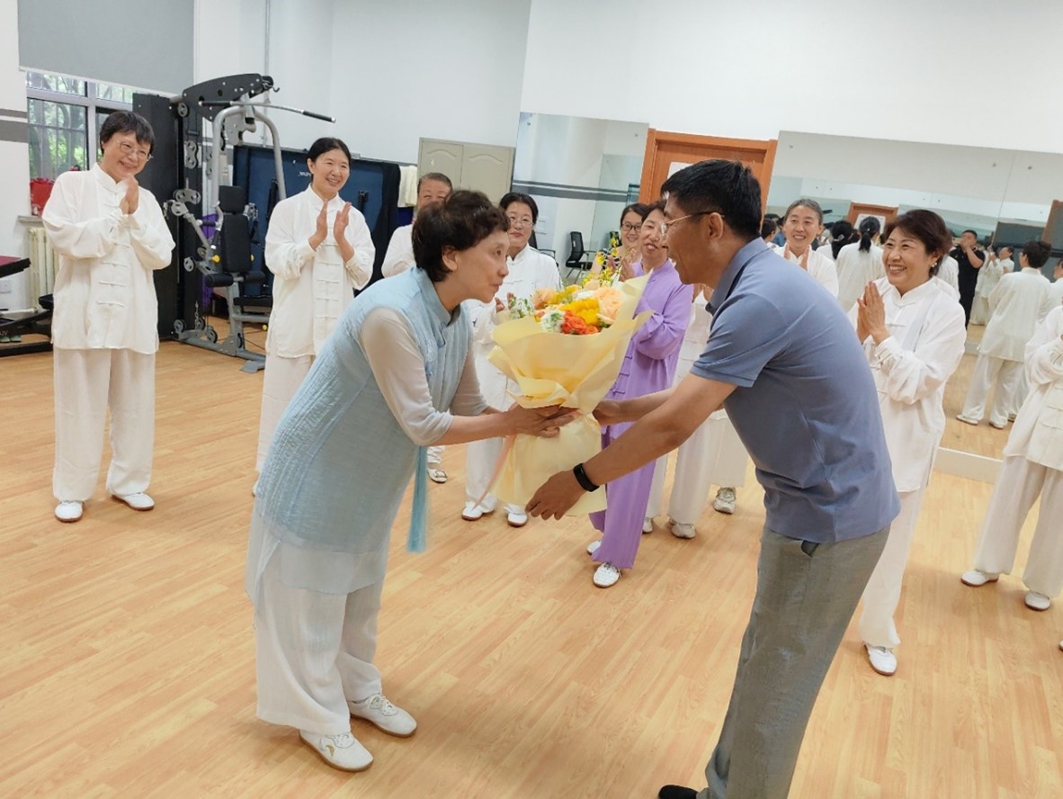 观看了太极拳社团的老师们精彩的太极拳后,党委书记赵军向教练张秋惠老师致以学院的问候。他说,学院的太极拳社团作为教职工的兴趣爱好社团,走过了7年多的时光,学院的教职工们在这里留下了宝贵的集体记忆,在练习拳法中增进了了解,加强了连结,也是好色