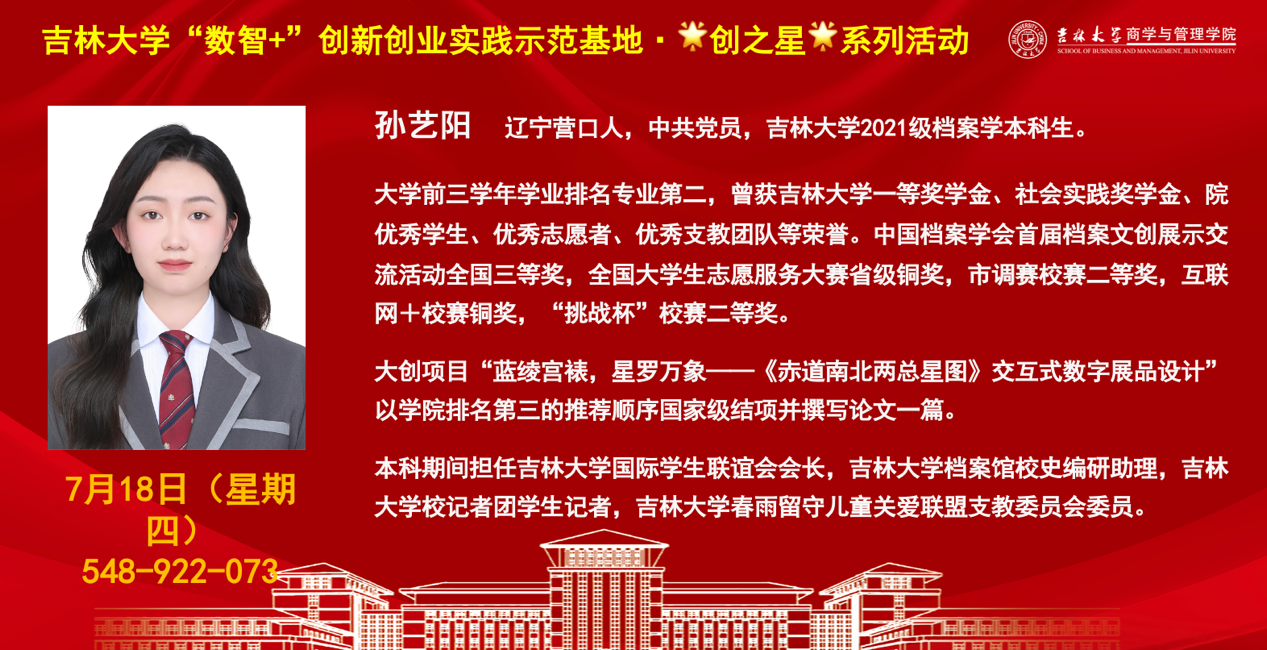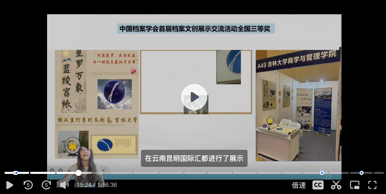 2021级档案学专业孙艺阳同学,以线上讲座形式、代表项目组成员分享其参与完成的“蓝绫宫裱,星罗万象——《赤道南北两总星图》交互式数字展品设计”大创项目,该项目以学院排名第三的成绩推荐国家级结项,其作品还参加了中国档案学会主办的全国首届档案文创作品展示交流活动,广受业内好评。艺阳同学从时间规划、灵感来源、选题与组队等方面,和与会学生进行了深入交流。