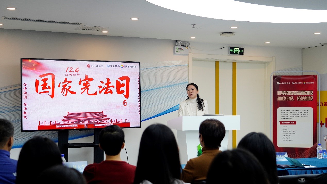 随后,吉林证监局法规处宿晓处长为师生带来了主题讲座,重点讲述宪法的内容与意义。她从宪法的基础性地位入手,阐述了其对证券市场规范的重要作用。并指出,宪法不仅是国家法治的基石,也为市场经济的有序运行提供了坚实的法律保障。