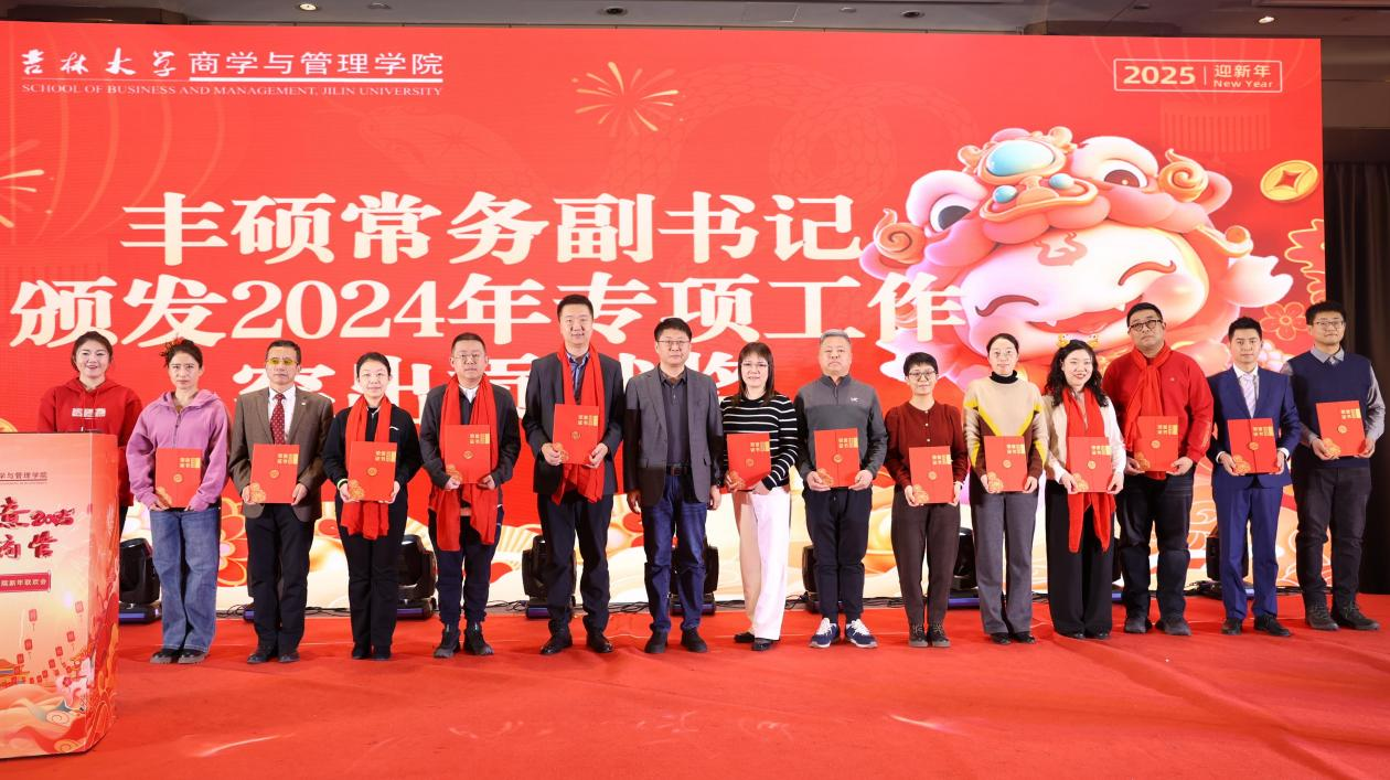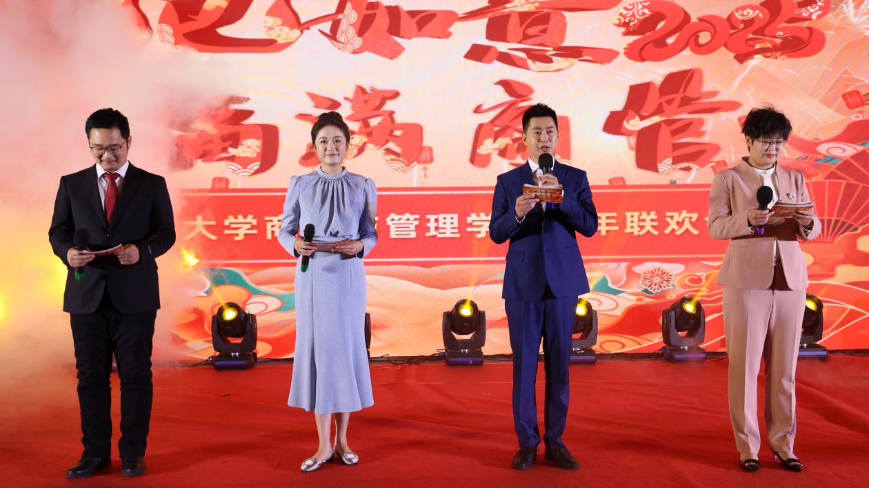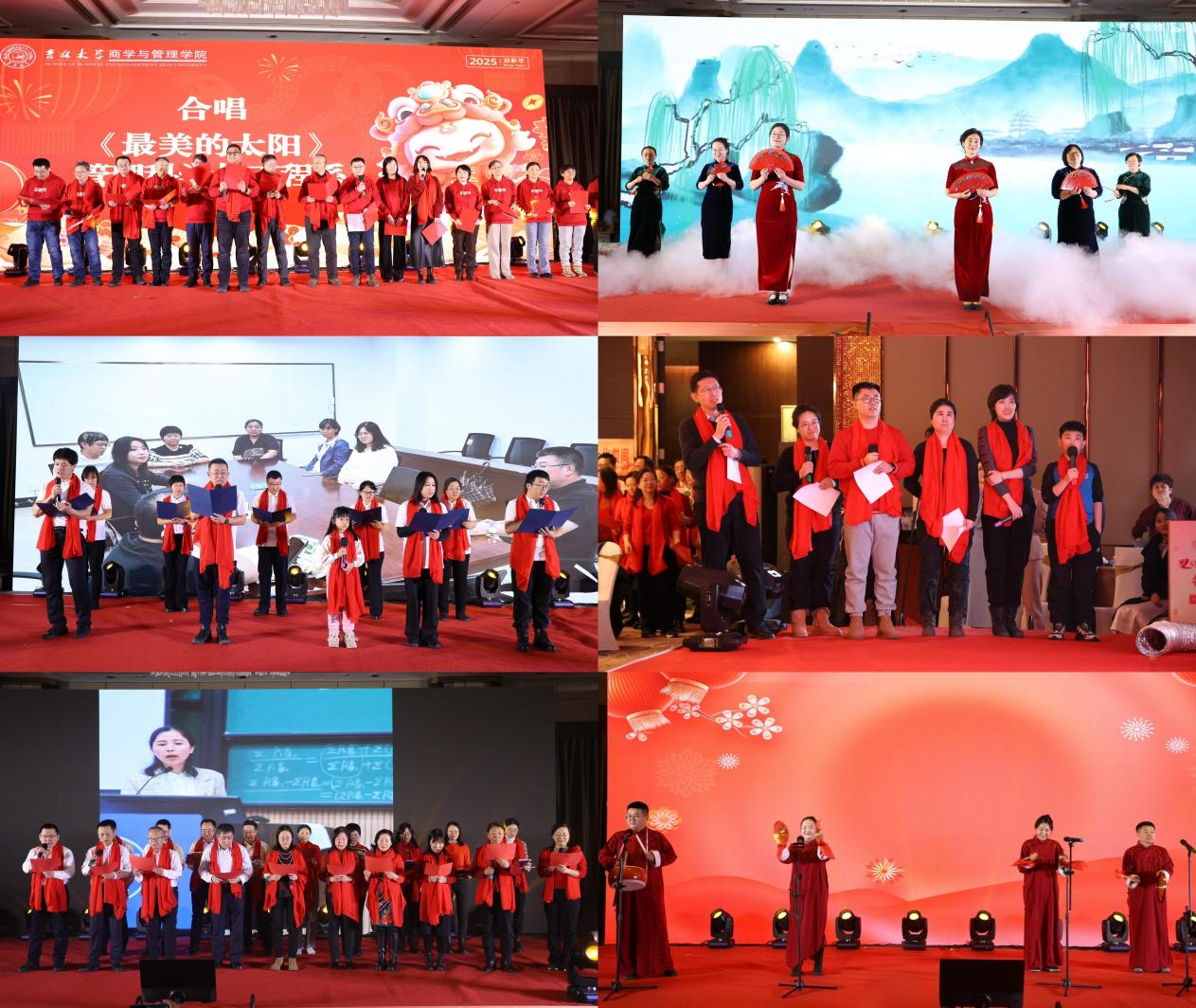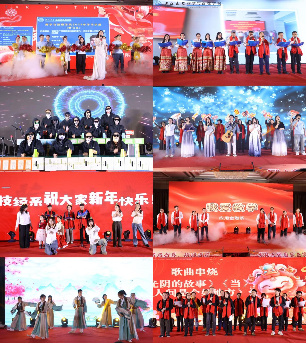 物流与供应链管理系全体教师用歌舞《喜乐年华》以欢快的节奏和喜庆的氛围,拉开了联欢会的序幕,展现了商管人迎接新春的喜悦与对美好未来的期盼。紧接着,组织与战略管理系的全体教师通过经典《校园歌曲串烧》,带领全场回顾了美好的校园时光,重温那些经典的旋律,感受着那份纯真的情感。市场营销系老师们带来的杯子舞《不是悲剧是杯剧,一场激昂雄壮的杯剧》则以独特的创意和激昂的节奏,演绎了一场别开生面的视听盛宴。信息管理系全体教师唱响《夜空中最亮的星》,从《明天你好》展望《明天会更好》,用歌声串联起对未来的美好祝愿,生动展现了全体商管人在过去一年中的守望相助,奋楫笃行,以及对未来的豪情满怀、美好展望。技术经济系全体教师的大合唱《敬业工作联盟》以激昂的歌声展现了商管人的敬业精神与责任担当。白山黑水,先生向北,迎难而上,踔厉奋发,我们将跟随党的步伐,扎根东北,无私奉献,学史鉴今守初心,阔步启航新征程。应用金融系全体教师的朗诵《我爱教学》诉说了商管老师们对教育事业的热爱与执着,金句频出,惊艳全场。国际商务系教师们以情景歌舞的形式,带来《上春山》,以生动的表演和优美的舞姿,描绘了春天的生机与希望,表达了老师们对商管学院蓬勃发展的美好祝愿。会计系全体教师的歌曲串烧《光阴的故事》《当》《人间是个好地方》则用歌声诉说着人间真情与美好,让人感受到生活的温暖与甜蜜。管理科学与工程系全体教师齐唱《最美的太阳》,老师们倾情投入,豪情万丈,传递出商管人对美好未来的向往与追求。人力资源管理系的全体教师带来了一支创新的舞蹈走秀《万水千山总是情》,点燃全场,展现了学院师生间的深厚情谊。财务管理系教师们带来的《歌曲联唱》将多首经典歌曲串联起来,展现了老师们多才多艺的一面和积极向上的精神风貌。工程管理与项目管理系全体教师则带来了一场精彩绝伦的配音秀《成长的烦恼》,使大家身临其境,感受了一场成长的烦恼和欢笑。数量经济系全体教师深情演绎《这世界那么多人》,悠长生命的晨昏中,感恩各自的遇见,美好的时光将留在梦田,永不散场。最后,由学院机关代表们带来了三句半表演,以幽默诙谐的方式,回顾了商管人在过去一年收获的累累硕果,为联欢会画上了圆满的句号。