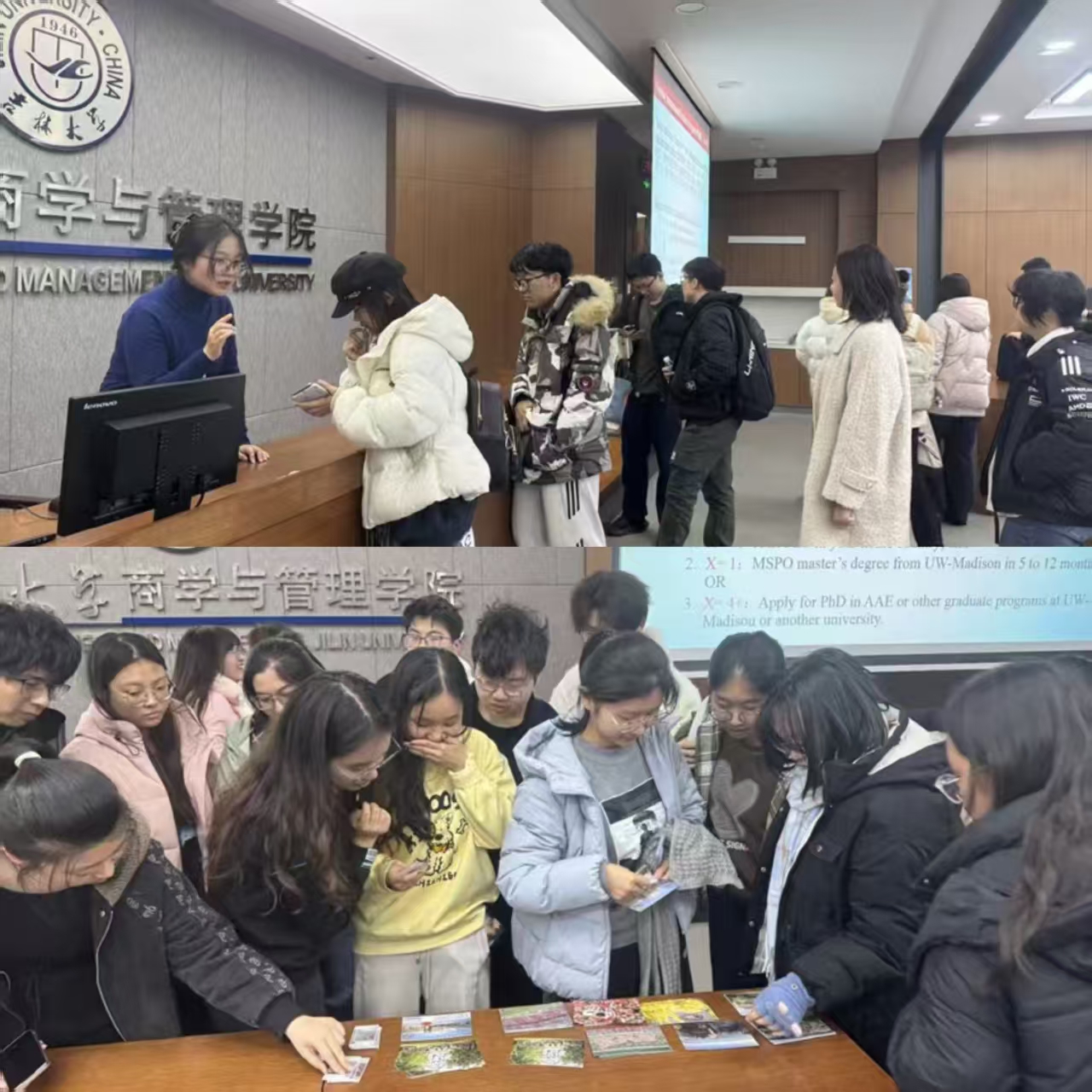 在互动环节中,同学们围绕申请条件、奖学金政策、课程安排与就业前景等问题踊跃提问。袁若寒老师进行了细致解答,现场气氛融洽而热烈,帮助同学们深入了解国际学习路径与未来发展方向。本次宣讲活动不仅进一步推动了吉大商管学院与威斯康星大学麦迪逊分校的人才培养合作,也为有海外深造意向的学生提供了有益的参考与启示。