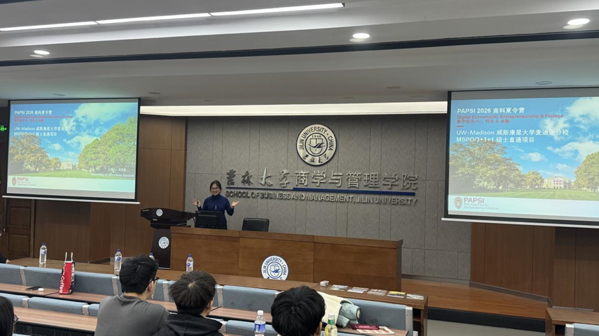 宣讲会伊始,师生们通过短片了解了威斯康星大学麦迪逊分校的校园文化与科研特色,感受这所公立常春藤名校的学术魅力。随后,袁若寒老师介绍了为期两周的PAPSI商科夏令营。该项目面向本科生与研究生,由UW-Madison三位教授联合创办,邀请UW-Madison、芝加哥大学、西北大学等高校教授及业界领袖授课,内容涵盖数字经济、人工智能、创业与金融科技等领域。通过讲座、案例分析与互动研讨,帮助学生提升创新思维与实践能力。学员将走访Exact Sciences、Epic Systems、Culver’s等企业及当地农场和酒庄,并参与芝加哥艺术博物馆参观、建筑游船、湖畔篝火等文化活动,体验中西部的商业与人文氛围。结业时,三位创始教授将颁发结业证书与LinkedIn数字徽章(Badge),表现优秀者还可获教授推荐信,为后续深造与职业发展助力。