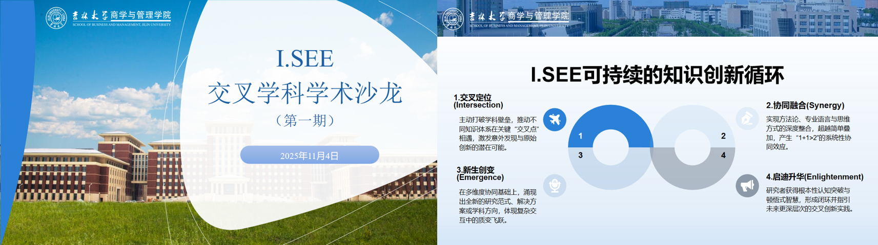 成功举办首期“I.SEE交叉学科学术沙龙”,聚焦跨学科思想碰撞与实质性合作探索。沙龙由常务副院长隋建利教授主持,党委书记赵军教授、副院长王金明教授全程参与。来自工商管理、应用经济学、信息资源管理、管理科学与工程四个学科的青年教师齐聚一堂,围绕“I.SEE框架”(I - Intersection (交叉)、S - Synergy (协同)、E - Emergence (新生)、E - Enlightenment (启迪))展开深度对话。
