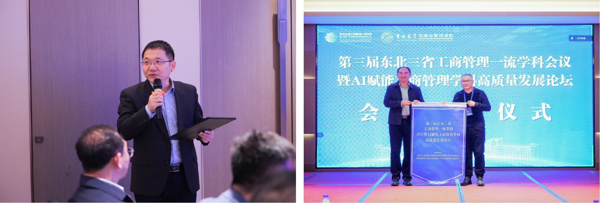 的代表、常务副院长隋建利教授,与下届主办方东北财经大学工商管理学院的代表、院长郑文全教授进行会旗交接。郑文全教授宣讲下届主办方情况,介绍学院学科建设成果,并期待明年相聚大连。