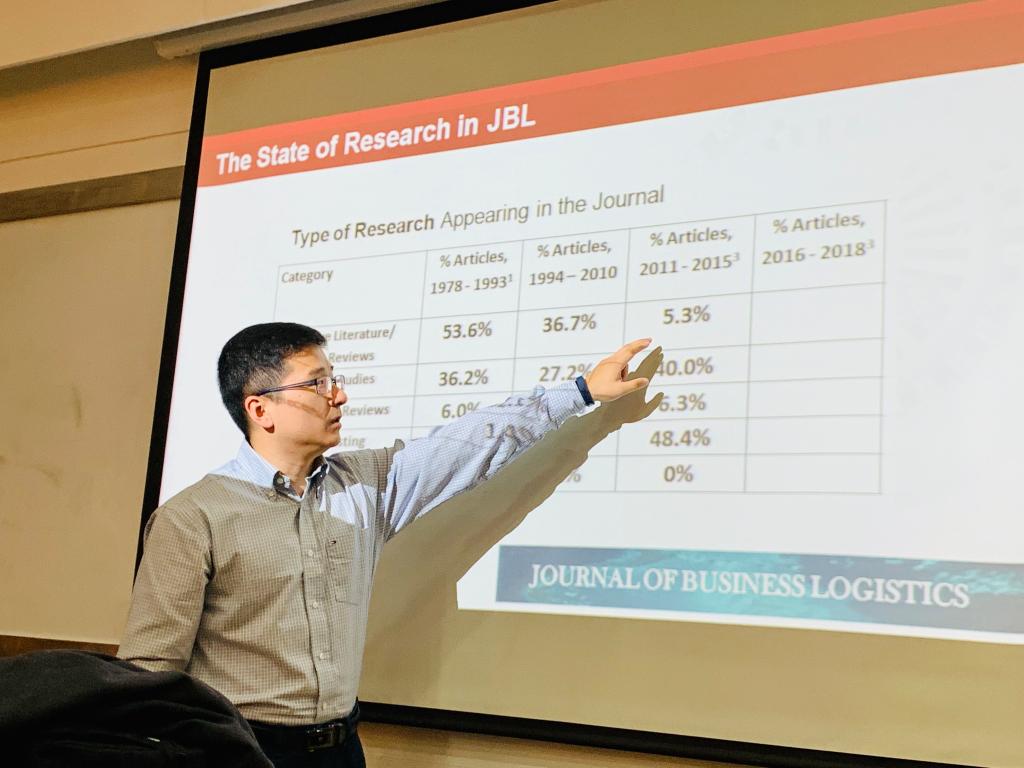 万翔教授首先介绍了他的研究方向及研究经历,然后以物流领域的顶级期刊Journal of Business Logistics为例,介绍了国际期刊的审稿流程、审稿周期、审稿标准、录用论文的分布以及近40年来收录论文与研究方法的变化。在这个过程中,万教授举了很多生动的实例,让在场师生对国际期刊的投稿和审稿有了更直观的认识。
