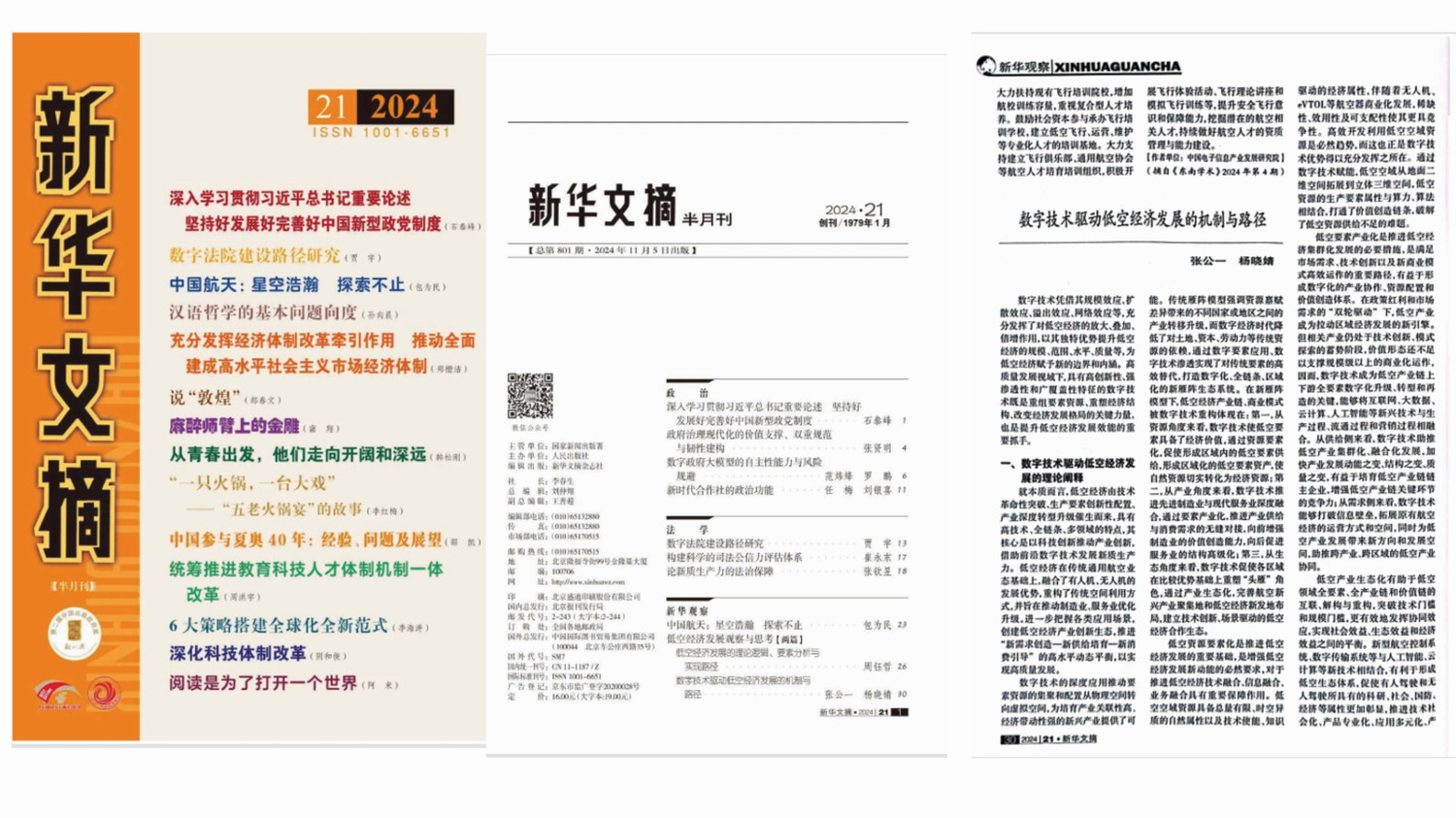 组建后首篇被《新华文摘》全文转载的文章,也是《新华文摘》首篇关于低空经济产业发展论述的成果,对我国数字技术驱动低空经济产业发展的演进具有重要意义。