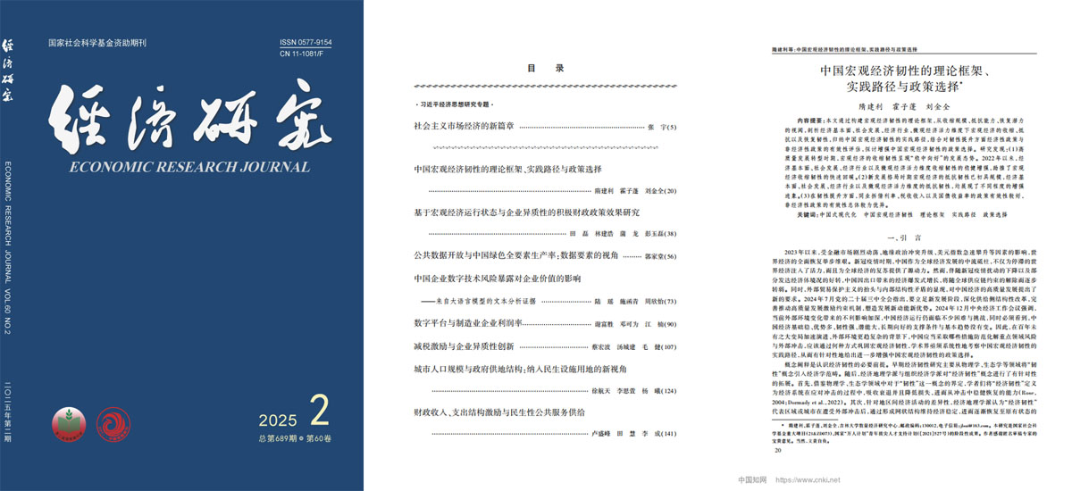 数量经济研究中心隋建利教授等在《经济研究》2025年第2期发表题为《中国宏观经济韧性的理论框架、实践路径与政策选择》的文章。