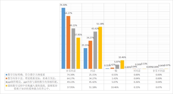 在教学内容方面,教师在授课时能够明确教学目标,且教学内容丰富,理论联系实际。教学目标清晰化是提高课堂教学效率的关键,能够帮助学生自觉地以目标指导自己的学习。丰富的课堂教学内容能够提升学生在教学中的参与度,提高学习效果。但在ppt制作方面有待加强,建议提高ppt的制作水平,重难点突出,加入图片动画等进行展示,帮学生理解知识点。课程思政的有机融入仍有提升空间,应寓价值观于知识传授和能力培养之中,达到润物细无声的效果。
