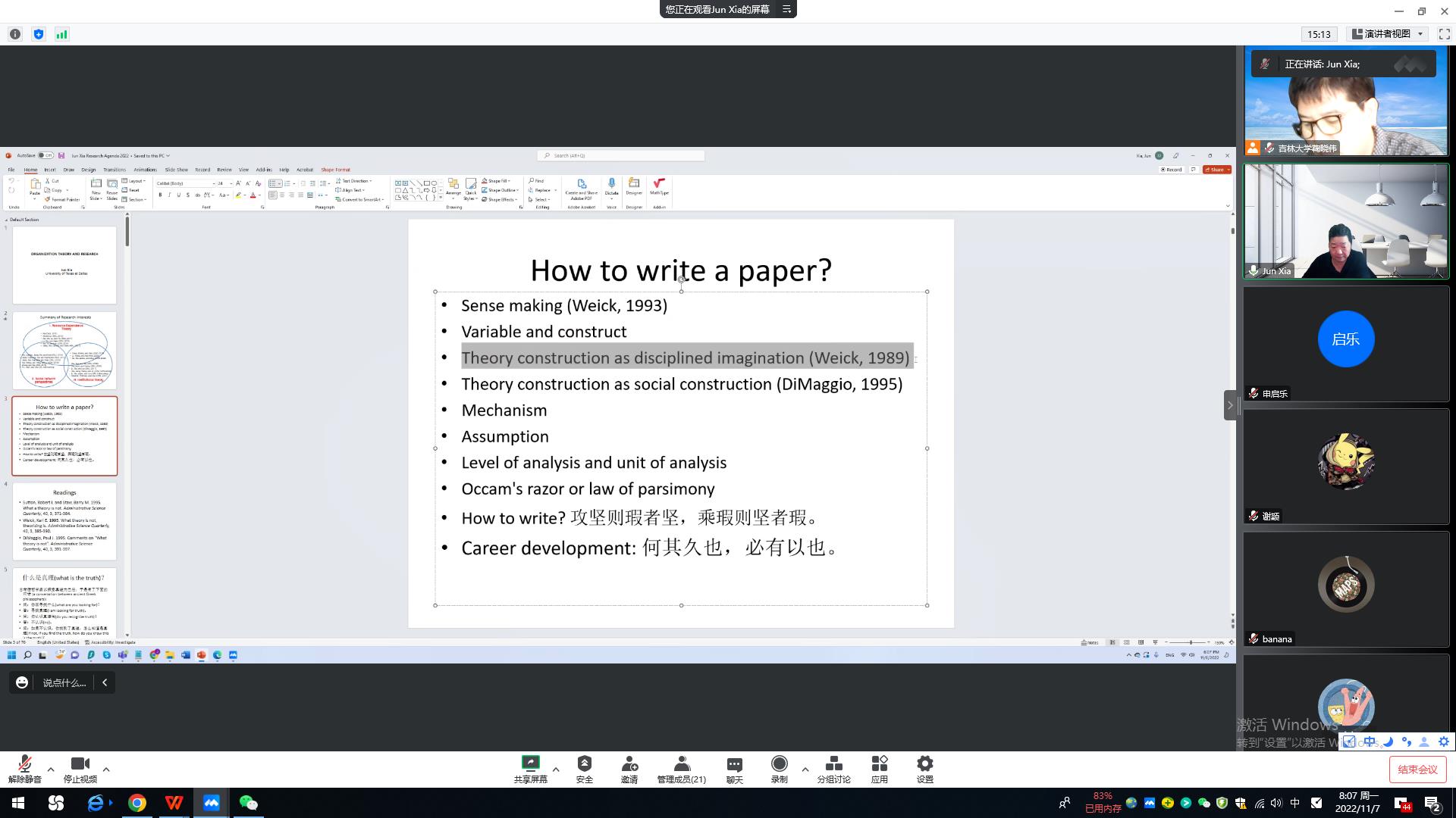 第二场讲座题为“Mechanism and assumption”。夏军教授围绕“Theory construction as social construction”的主题展开,认为理论的建构一定离不开训练有速的想象力。那么,理论是怎么产生的呢?主要有两方面:一是达尔文进化论,从Variation到Selection再到Retention。另一个是Weick在1999年提出的“Problem Formulation, Thought Experiments, Selection Criteria”的过程。随后,夏老师通过分享几组图片与师生互动来说明每个人看事物的角度是不同的,而由此产生的问题便是由于看问题的角度不同导致大家对同一篇文章的看法不同。夏教授强调“Imagination”的能力是非常重要的,这种思想是写文章的生命之源,只要找到了适合自己的理论,然后Make sense,通过不断的积累,不断的做,最后写出的文章自然地就会超越前人。讲座为师生们提供了非常有益的思考和帮助,极大地开阔了同学们的科研视野,得到在场师生的一致好评。