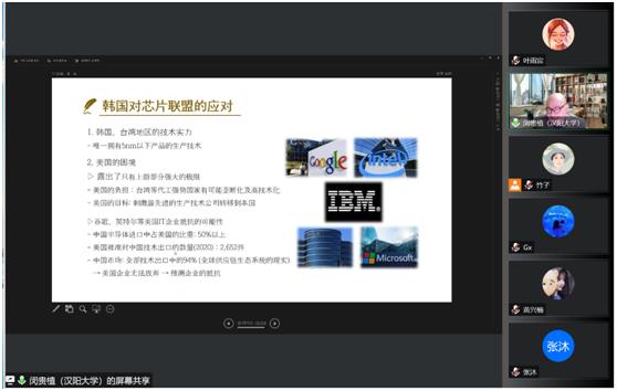 应用金融系邀请到了韩国汉阳大学国际学大学院中国系闵贵植教授进行分享交流。讲座由应用金融系董竹教授主持,应用金融系的各位老师、研究生及本科生等30余人参加了本次讲座。闵贵植教授带来的讲座题目是“中美战略竞争与韩国的应对”。长期从事中国政治思想、制度与文化的研究,闵贵植教授将其基础科研成果持续扩展,特别是中美的战略竞争格局在半导体、芯片等领域的拓展思考。分享结束后,参会老师与闵贵植教授进行了深入交流,陈顺红和张安琪同学也与闵贵植教授在中美关系和韩国应对的研究角度上进行了探讨。本次报告启发了相关领域的研究思考,也为同学们拓宽了中美战略竞争问题的思考角度。