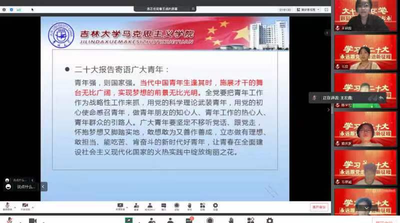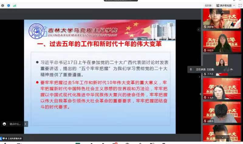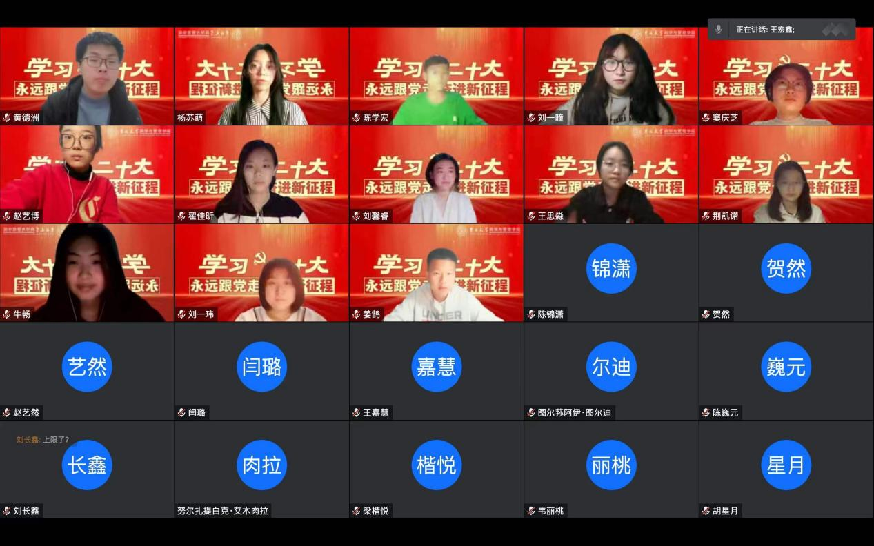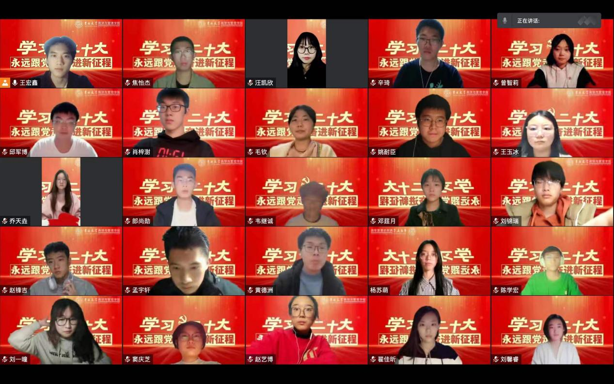 为扎实落实学校党委关于学习宣传贯彻二十大精神的工作部署,深刻领会二十大报告的思想、内涵、部署、要求,切实把思想和行动统一到党的二十大精神上来,党委学生工作部统一部署、精心策划,于2022年10月29日线上召开党的二十大精神系列宣讲活动第一讲,由马克思主义学院教授王成老师担任主讲人,中心校区各学院本科生党员、预备党员、入党积极分子代表参加会议。