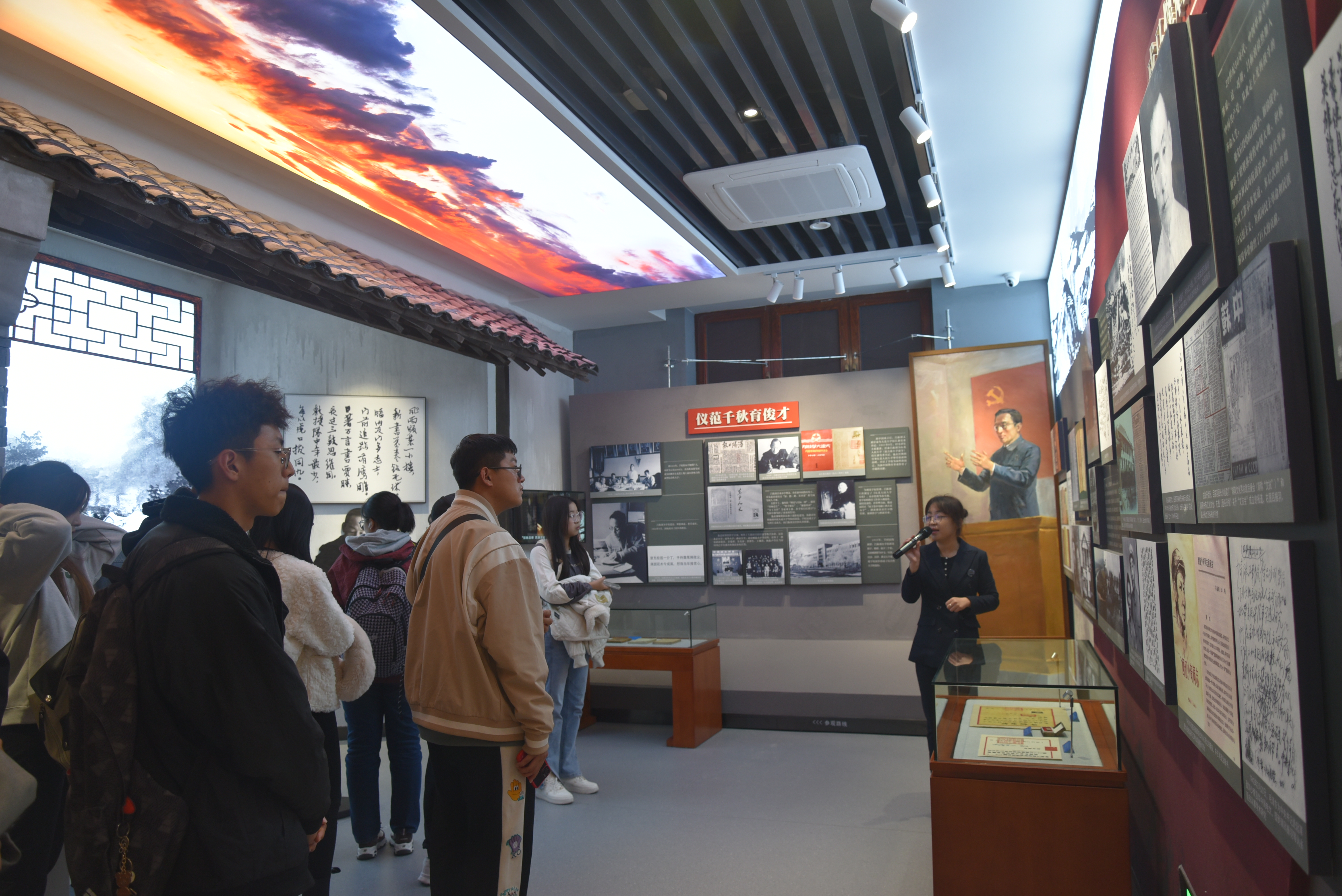 名人纪念馆后,在讲解员的带领下,同学们依次进入场馆。纪念馆外观大气稳重、空间布局合理、陈列布展内容丰富。同学们参观了“创校先驱”、“功昭校史”、“滋兰树慧”等展区,展区记录展示了林枫、饶斌、江一真、李四光、陈先舟、任抟九等64位拓业先贤,为好色