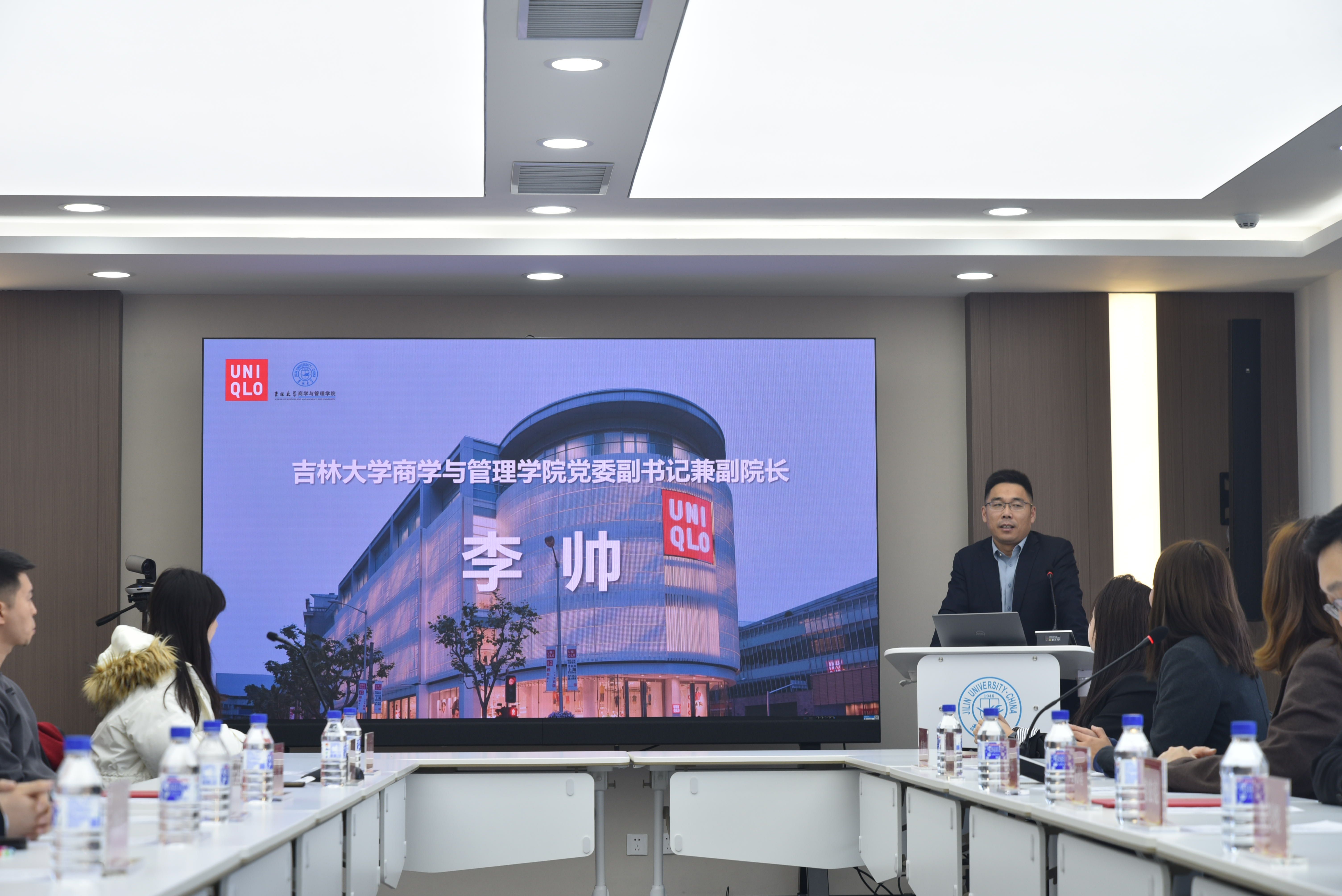 李帅书记致开幕辞,李书记依次从学院发展历程、校企合作、学生培养等方面为到场嘉宾进行了介绍,强调了企业的发展与社会发展密不可分,并对迅销优衣库积极承担社会责任,关爱吉大学子表达了感谢。