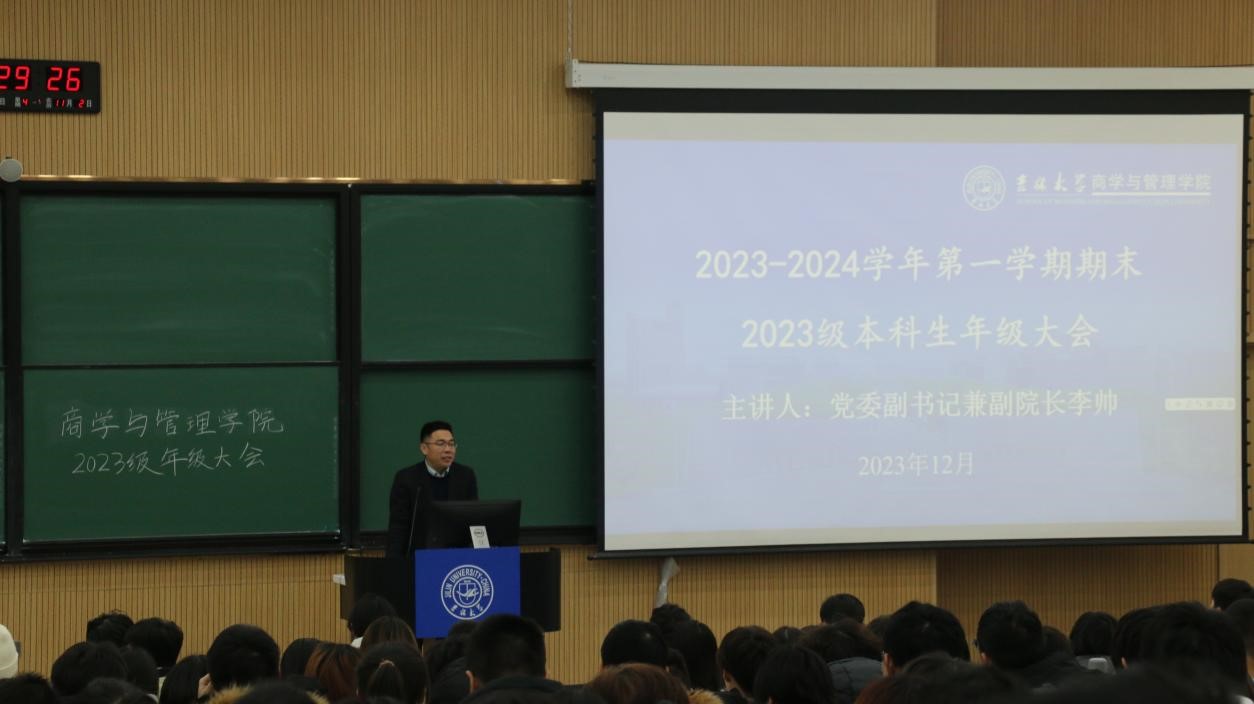 会议开始,李帅书记高度关心同学们身体健康问题,尤其在目前寒冬之时更要注意保暖,防止流感等,以保证健康的体魄和精神状态。其次,李帅书记对正值青春年华的同学们寄予厚望。尤其在学习和全方面的素质提高上,鼓励并相信商管学子力争上游,无论未来的规划是学术深造还是走向社会,都要让过硬的本领指引人生千万种美好可能。随后,书记强调对于临近的期末考试,同学们要保持好诚信责任的考试态度,公平公正参加考试。接着,书记提醒同学们生活和学习中的问题都可以与他和辅导员老师们沟通,大家一起在交流互鉴中成长。最后祝愿同学们取得佳绩,平安归家,享受愉悦寒假和幸福团圆的春节。