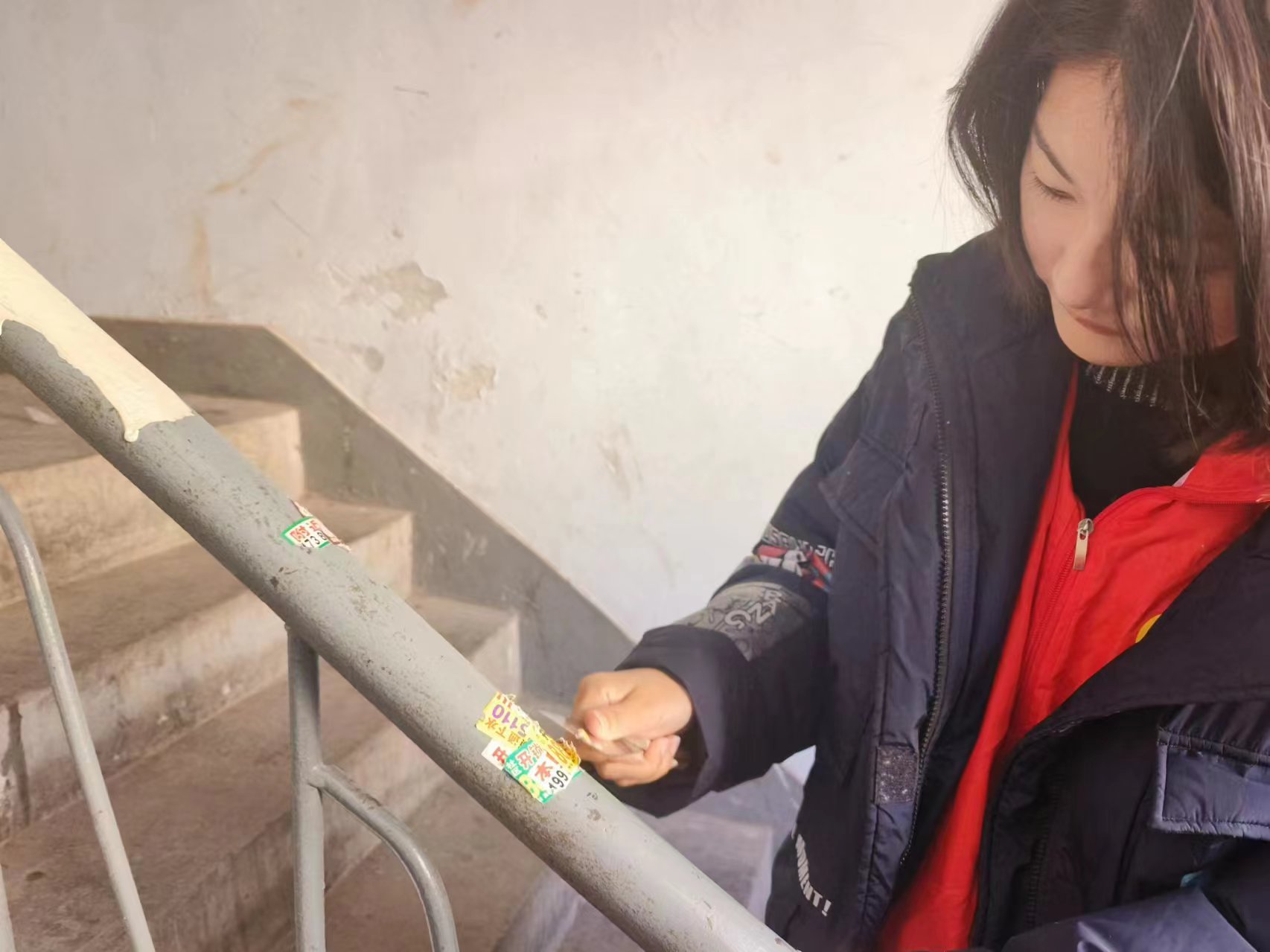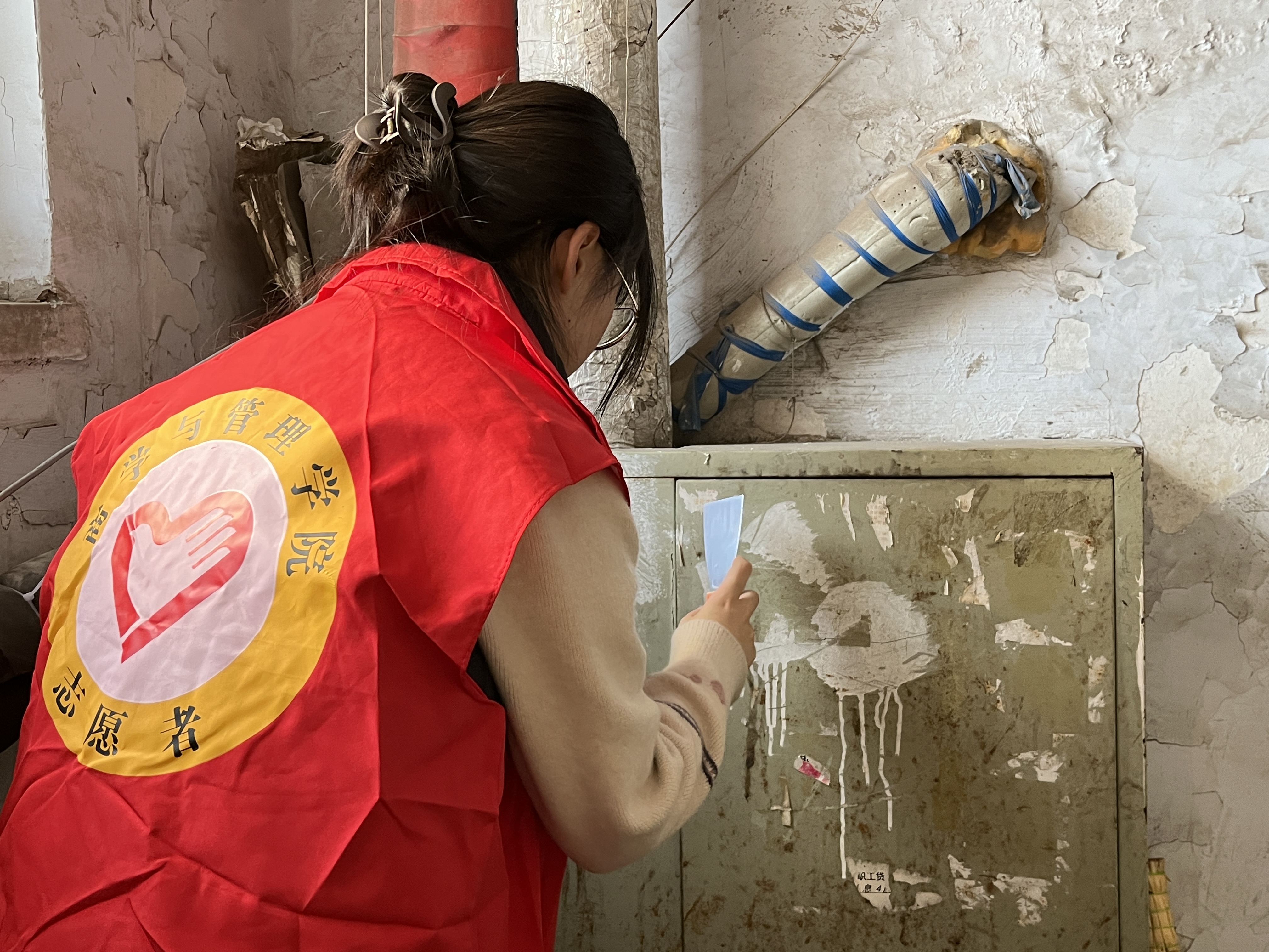 2024年3月4日下午1点钟,志愿者们在湖畔北门停车场集合后乘坐大巴前往建工社区。一点半抵达建工社区后,红旗街道建工社区书记安爽热情接待志愿者们,耐心详细地介绍了志愿服务活动的任务——深入社区清理楼道中的小广告以及邪教宣传内容。了解清楚任务后,志愿者们立即行动起来,拿上扫把和小铲子,两两一组清理小广告,楼道墙壁、扶手、住户家门上牛皮藓似的小广告在同学们热火朝天的热情下很快被清理干净,建工社区居民楼的楼道在志愿者们的劳动中焕然一新。