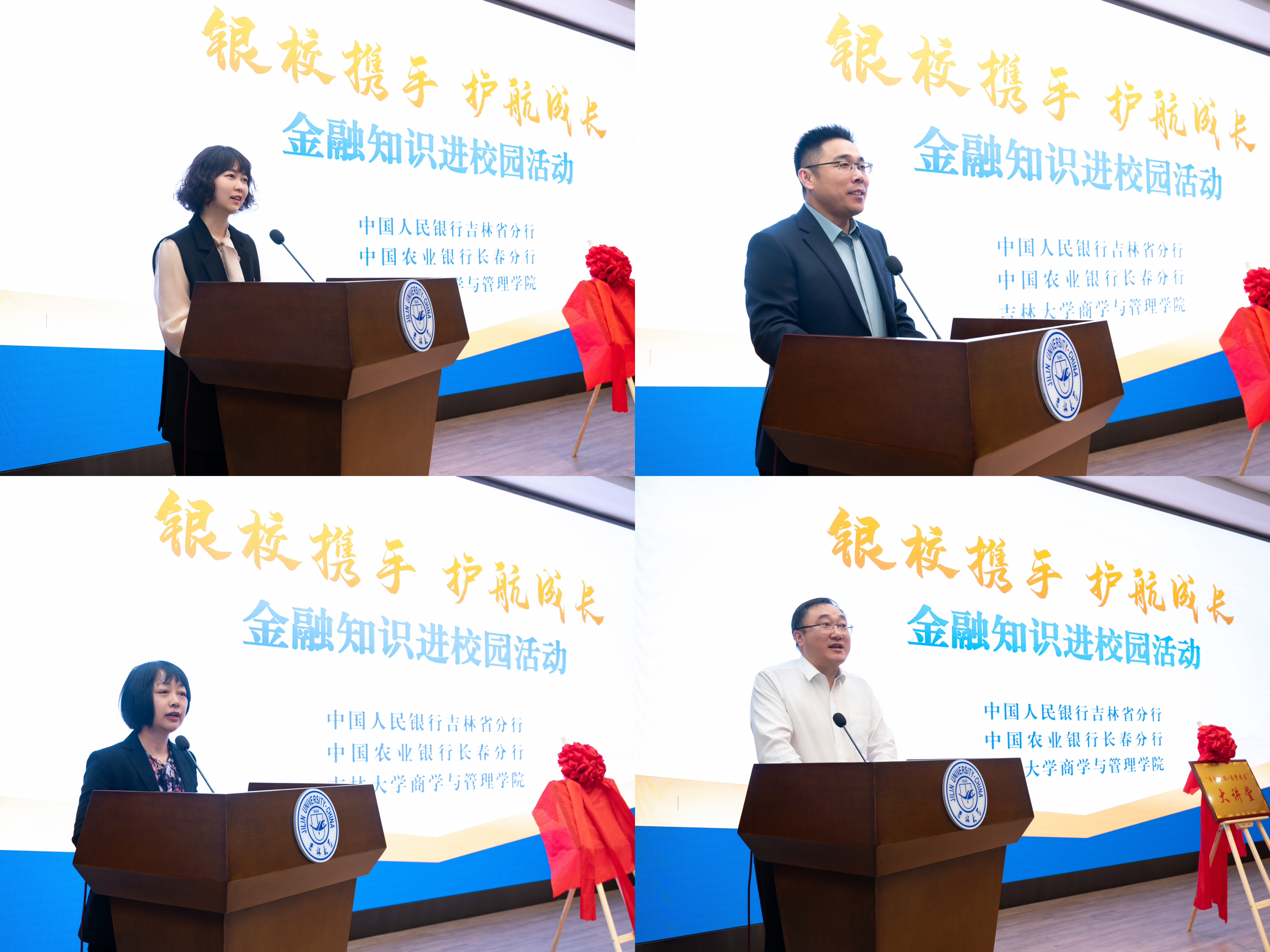 党委副书记兼副院长李帅老师致辞,李帅老师向各位领导的到来表示了热烈欢迎并希望未来能够和银行合作共赢、共同发展,将论坛和品牌持续发展下去。随后由中国人民银行吉林省分行宣传群工部朱慧玲部长做讲堂推介,朱慧玲部长向大家介绍了金融作为学生未来工作的重要性,希望同学们能够学懂金融,用好金融。在建设金融强国的大背景下,进一步加强中国人民银行吉林省分行与农行长春分行、吉大商管学院的沟通联动,切实推进讲堂建设不断深入。接着三方领导为“金融赋能·圆梦成长”宣讲品牌揭牌启动并合影留念。启动仪式后,由中国农业银行长春分行党委委员张鹏副行长做开篇第一讲,张行长着重为大家介绍了学习金融知识的重要性,希望同学们未来能够为金融高质量发展作出自己的贡献。