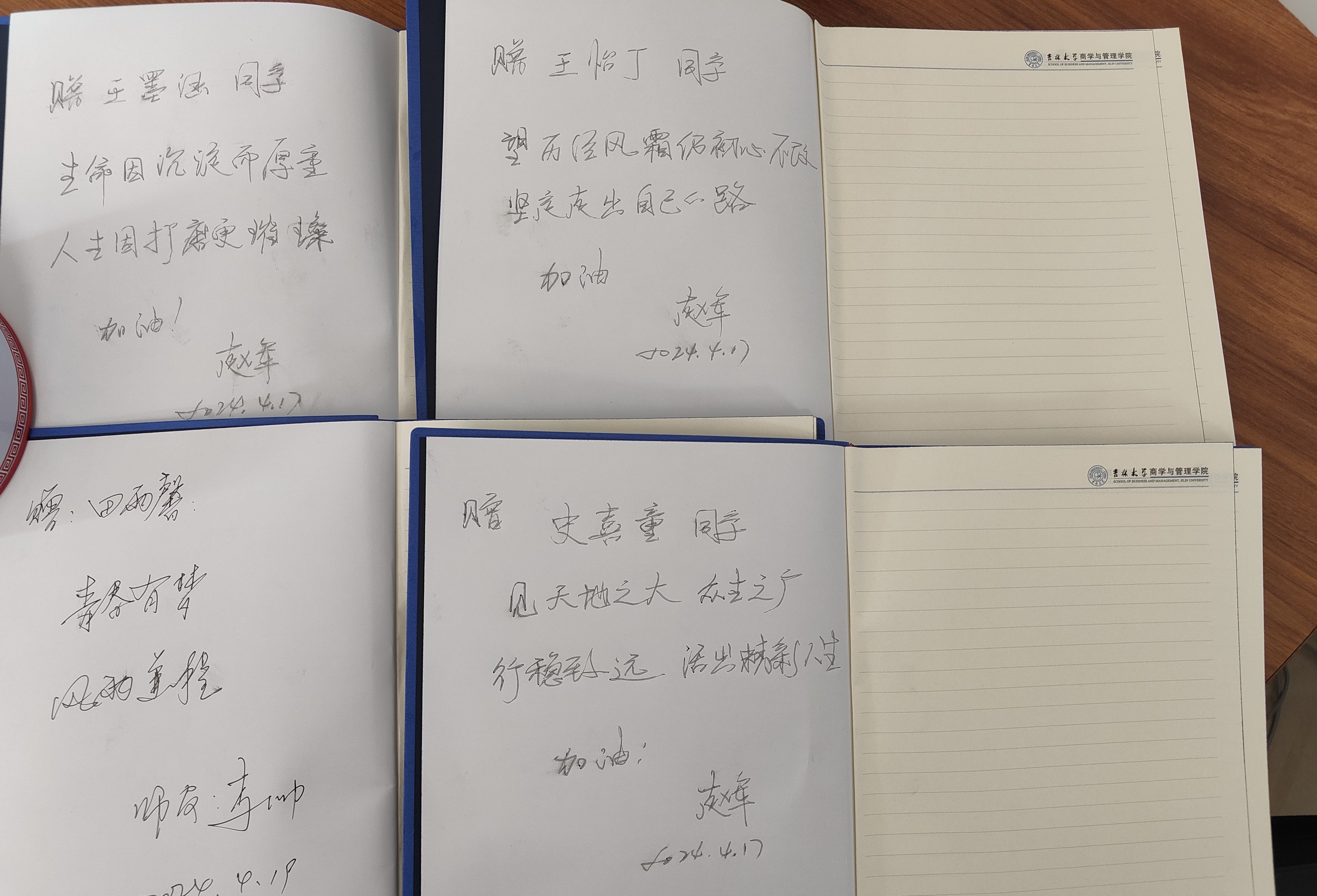 的一份子,老师们也永远会为大家保驾护航,话语间充分流露出对同学们的关怀之情。更为细心的是,在每一本给予同学们的笔记本上,都有来自学院党委书记赵军老师、李帅老师、陈卓老师和罗小杰老师写下的对转出同学的殷切希望和衷心祝福。
