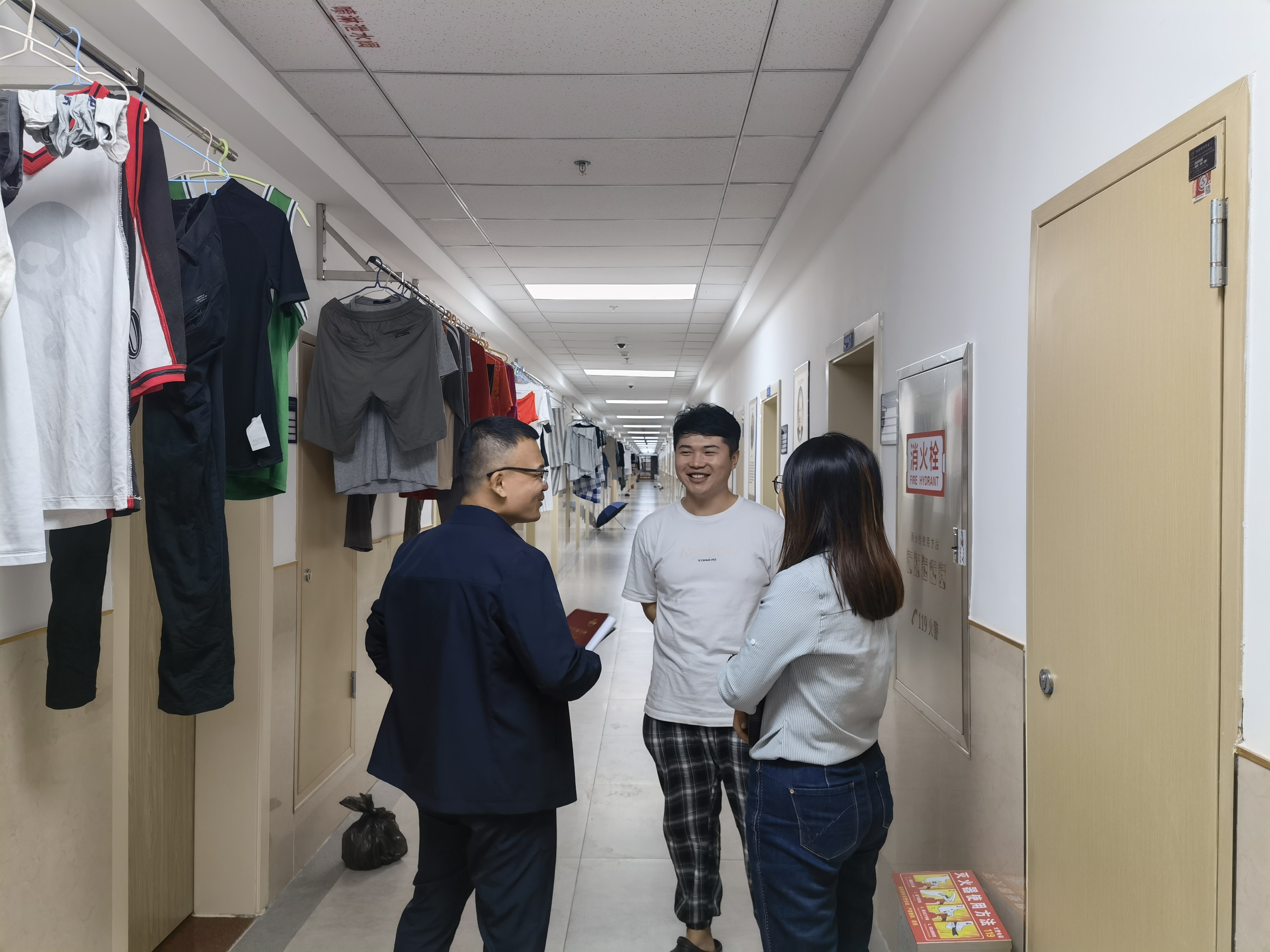 在走访过程中,马腾老师对寝室的安全和卫生问题进行了检查,告诫同学们要注意用电安全和寝室卫生,同时还叮嘱同学们要严格遵守学校疫情防控规定,戴好口罩,少去人员密集的场所,在寝室中注意消毒通风,减少病毒传播的风险。马腾老师和裴月莹老师亲切询问了同学们的返校时间、返长地点以及暑期的收获。最后同学们还与老师聊起了自己新学期的课程及科研安排,表达本学期会努力学习,努力科研。