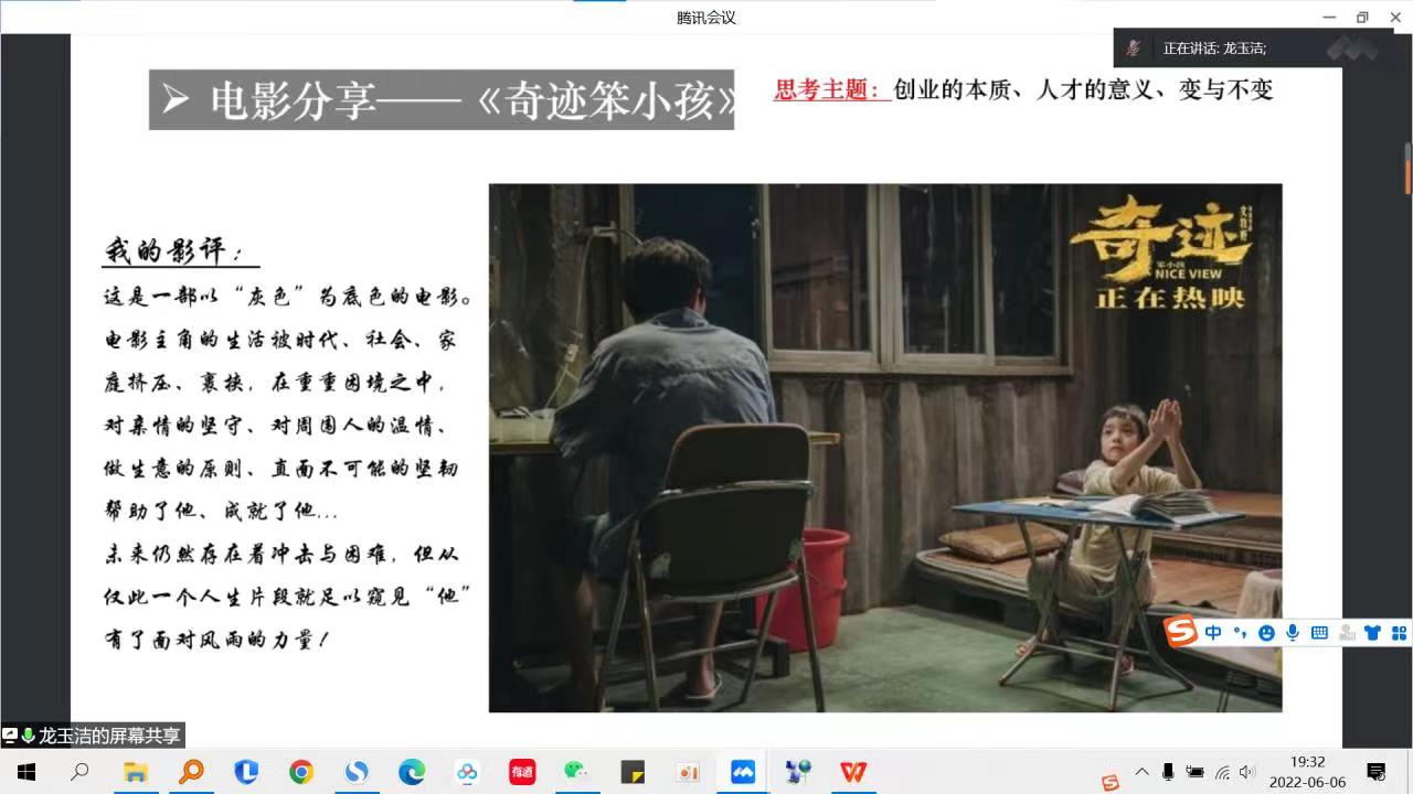 会议开始,18级博士生龙玉洁围绕电影《奇迹笨小孩》,从自身对电影的思考进行了全方位的分享。具体内容包含以下几方面:电影情节梗概、创作者和创作背景、理论思考延伸、其他阅读材料与演讲技巧总结等。随后,博士生樊镁汐、张向、王逊、张笑妍,硕士生王馨凝也分别就自身对演讲的感受和思考一一进行汇报总结。