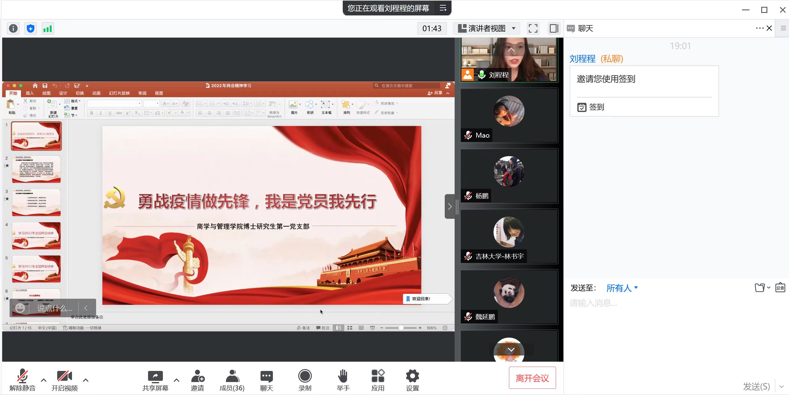 其次,大家共同回顾了疫情发生以来,我们身边涌现出来的“平凡英雄”的事迹。疫情防控期间,尽管存在诸多困难,但是仍然有默默守护在学生身边的老师和后勤工作人员,我们身边也有非常多的同学加入到志愿队伍中,冲锋在防控一线,体现了当代青年学生的使命与担当。支部内志愿者党员同学也纷纷表示自己将始终牢记习总书记的嘱托,以“我是党员我先上,疫情不退我不退”的信念坚持到底。