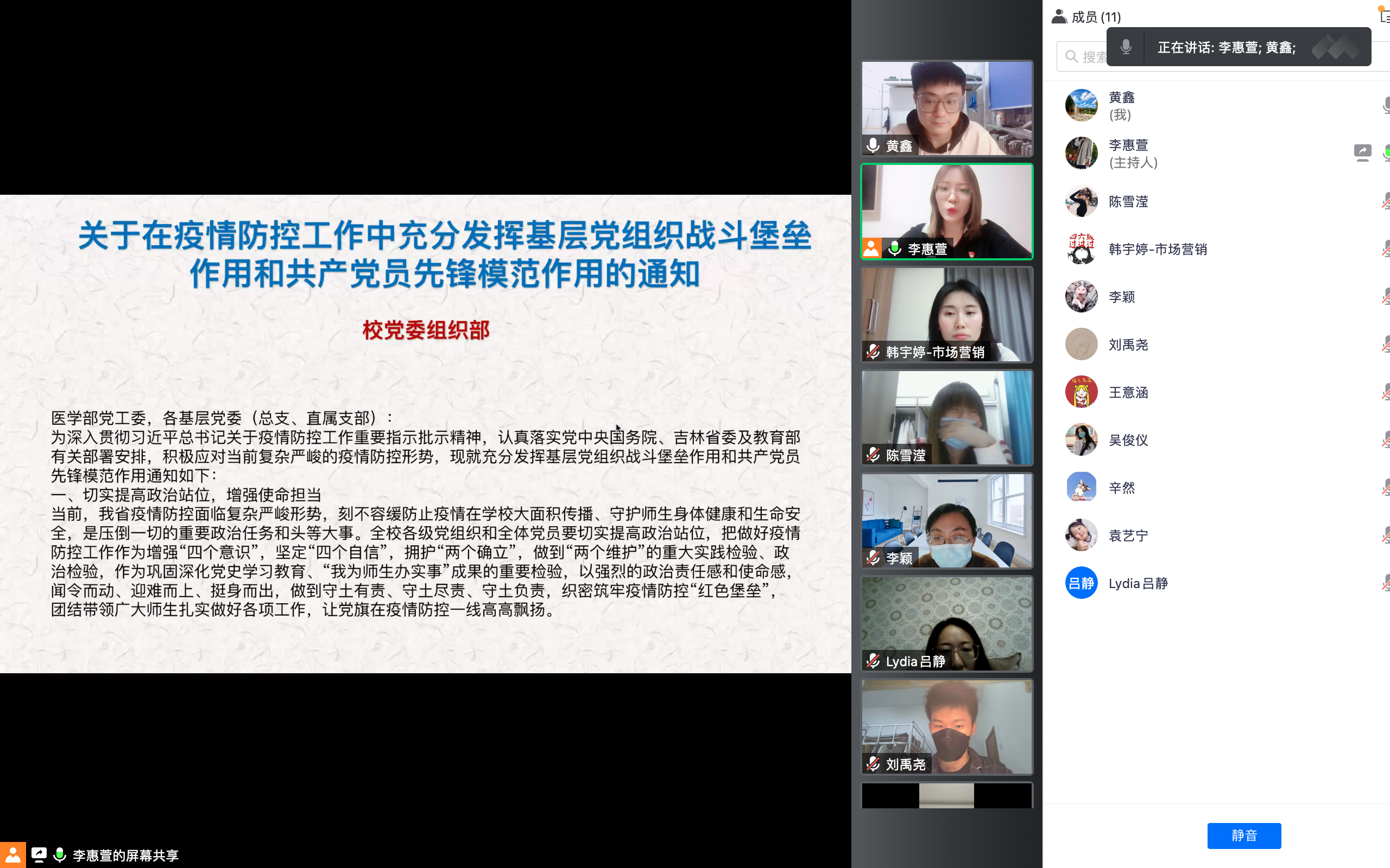 首先,为深入贯彻习近平总书记关于疫情防控工作重要指示批示精神,认真落实党中央国务院、吉林省委及教育部有关部署安排,积极应对当前复杂严峻的疫情防控形势,充分发挥基层党组织战斗堡垒作用和共产党员先锋模范作用,支部书记李惠萱同志宣读了由好色