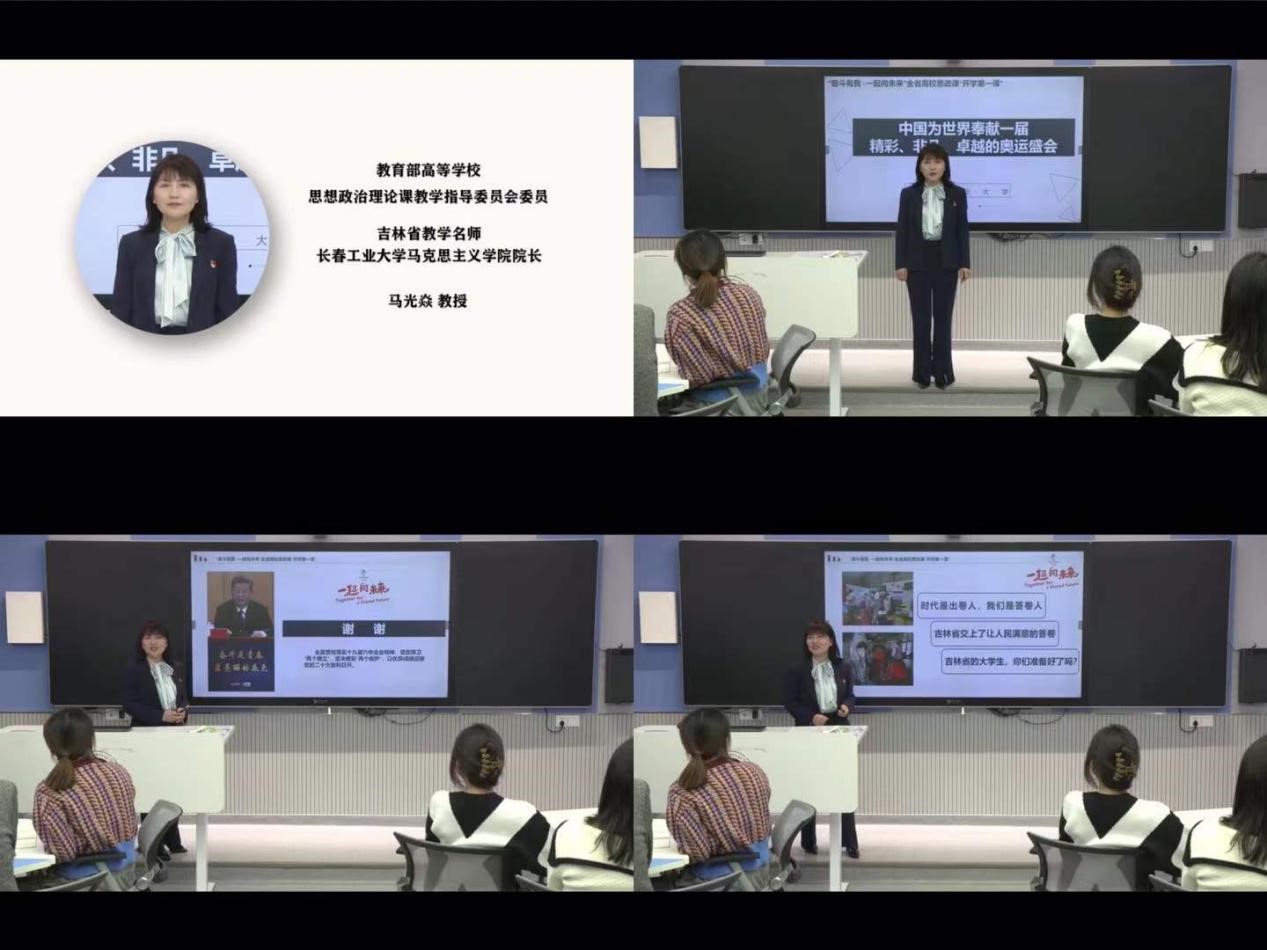 教育部高等学校思想政治理论课教学指导委员会委员、吉林省教学名师、长春工业大学马克思主义学院院长马光焱教授讲授以“中国为世界奉献一届精彩、非凡、卓越的奥运盛会”为主题的思政课,帮助学生深刻认识 2022 年北京冬奥会成功举办对于展示国家形象、促进国家发展、振奋民族精神的重要意义,进一步激发广大青年学生爱党爱国爱社会主义情怀,努力争做担当民族复兴大任的时代新人。